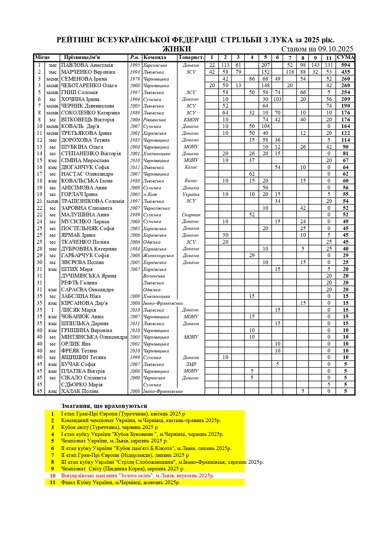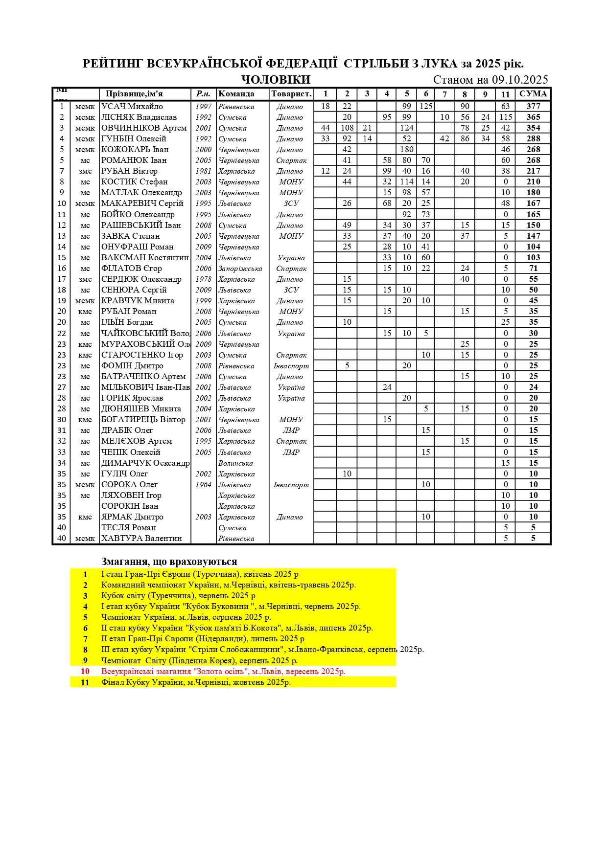 РЕГЛАМЕНТ проведення фіналу Кубку України зі стрільби з лука, ІІІ ранг (06-09.10.2025р., м. Чернівці) 11.09.2025